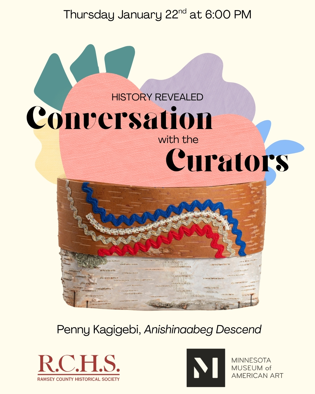 Join RCHS in a conversation with the curators of the Queering Indigeneity exhibit at The M. The exhibit is part of a project that artist and curator Penny Kagigebi and supporting curator Ben Gessner have worked on for several years in collaboration with The M to amplify the stories of 2-Spirit and Native queer artists. The exhibit tells the story of an important community role that was pushed aside as the result of colonization and is being revitalized through art, storytelling, and joy. We will discuss the origin and necessity of this project, the significance of an entirely Native queer gallery show, as well as the impact of Native queer folx in Ramsey County.