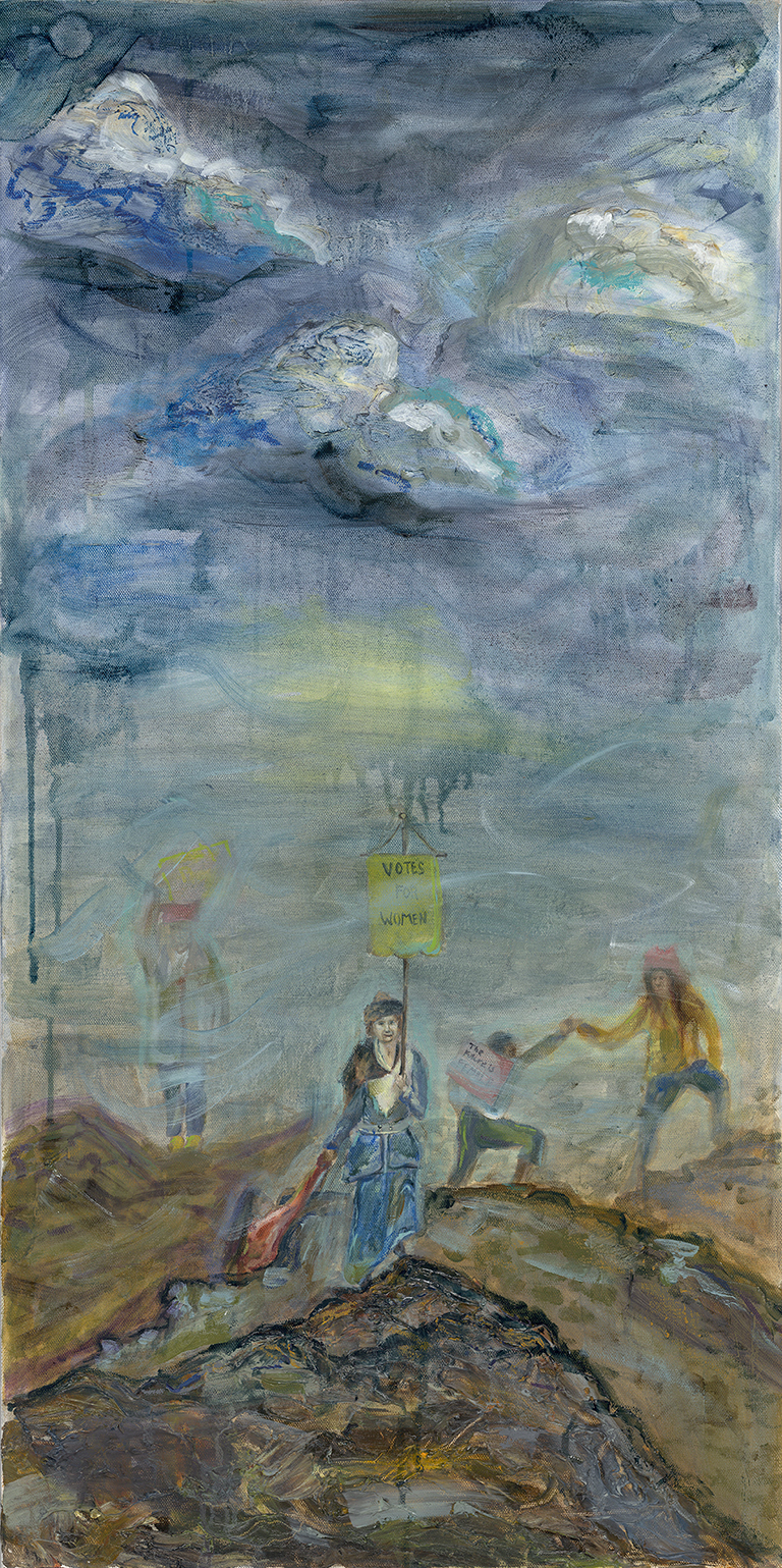 We are currently faced with an unstable environment and many uncertainties. Many of the uncertainties we face today parallel those of 100 years ago. I created a metaphorical environment with my paint to reflect the struggles and uncertainties that women face. Layers of my paint create a stormy turbulent environment with the atmosphere swirling around the women, while small rays of sunshine peak out from the storm clouds, indicating the possibilities of the future. Bertha Moller leads a group of protesters over rocks and unstable ground. Although she rises above the rocky terrain and is foregrounded, she still has not been able to traverse through all of the rocks. The continued expanse of rocky ground points to all of the work yet accomplish in the fight for true equality for all. The layers of space behind the women demonstrate how far the work of women suffragists has come. Even though we often think of the work of suffragists as in the distant past, in this painting Bertha Moller is able to transgress time and lend a hand and her leadership to those who continue her work today.